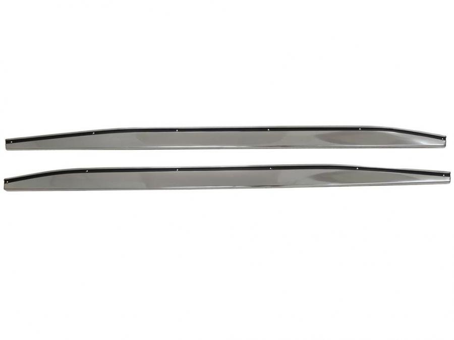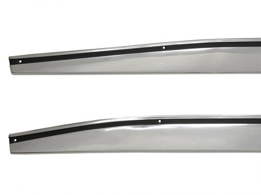 These side fender lower rocker trim panels are bright polished aluminum with a clear anodizing and a black painted strip containing the attachment screws running below the upper edge. It is attached to the body with black oxide, Phillip’s oval head screws.