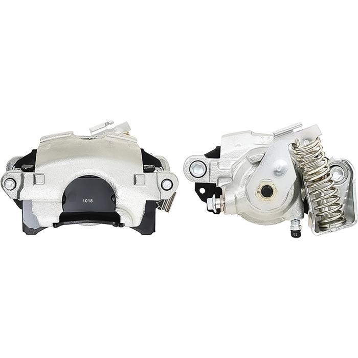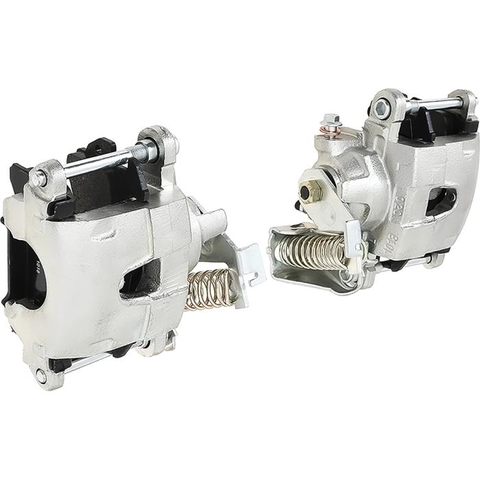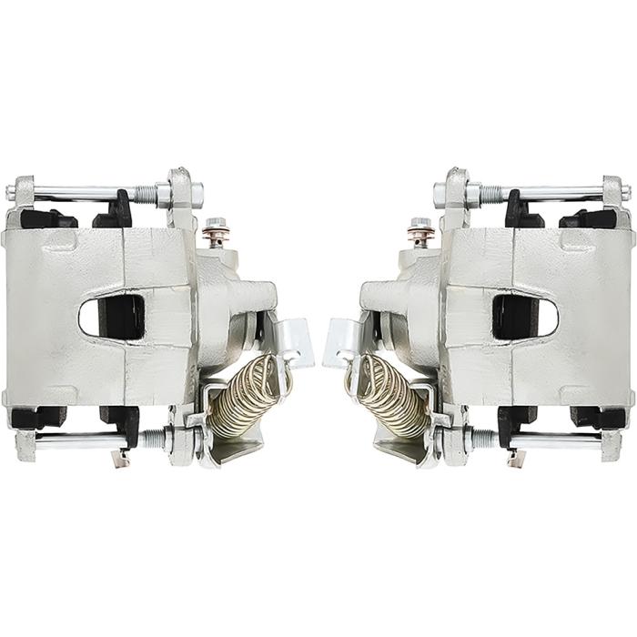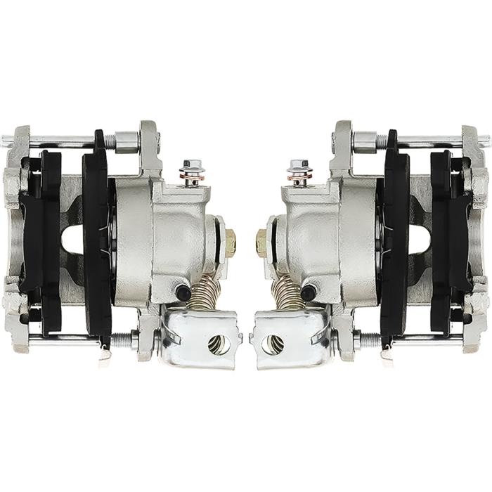 Reproduction calipers based on the 1979-up factory GM-style metric calipers that accept either original GM or Lokar type emergency brake cables. Fluid inlets are tapped to accept 7/16-20 banjo fittings. Each caliper includes the bracket to attach the emergency brake cable, slider bolts, and brake pads. The banjo bolt is 10mm x 1.5. Mounting bolt spacing is 5.5". Come loaded with D154 GM style brake pads. Also very popular for rear disc brake conversion equipped 1967 Camaro and Firebird models with non-staggered shock layout that requires "mirrored" rear calipers with park brake mechanism on opposite sides. Calipers feature a silver zinc finish. Sold as a pair of calipers including (1) LH and (1) RH side.