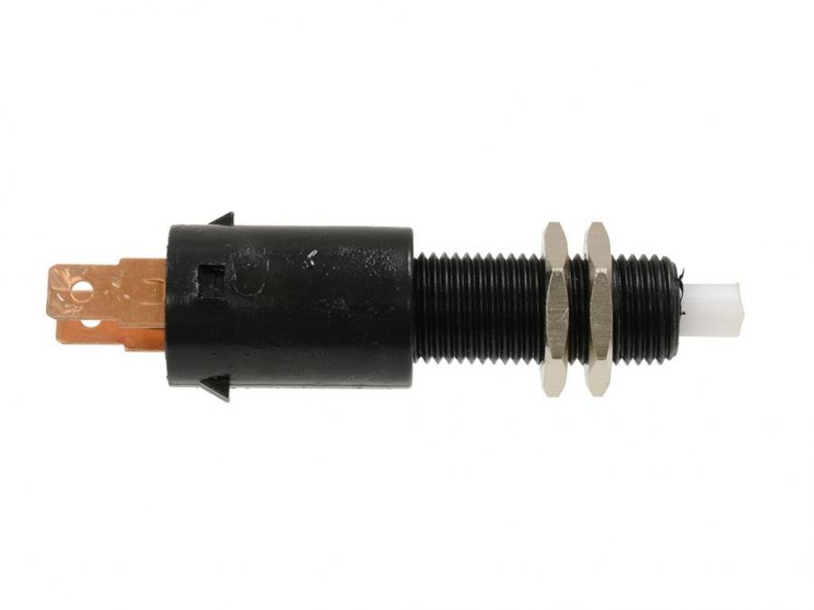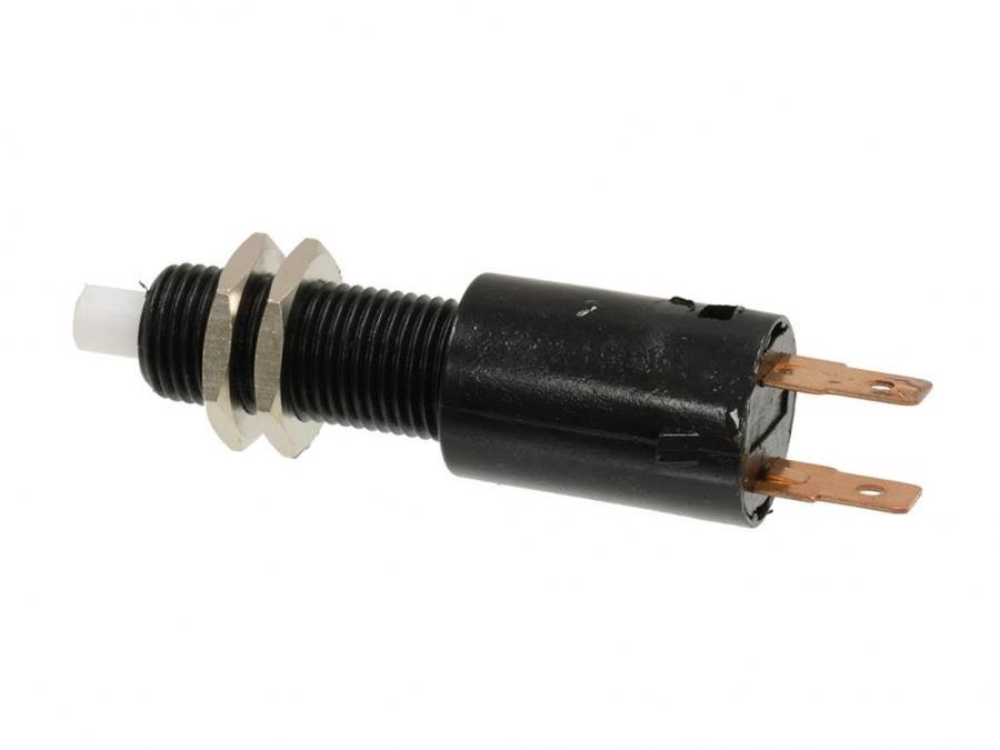 Black molded plastic stop lamp switch, mounts under dash on brake pedal support. Note: Original switches were metal. Includes mounting nuts.