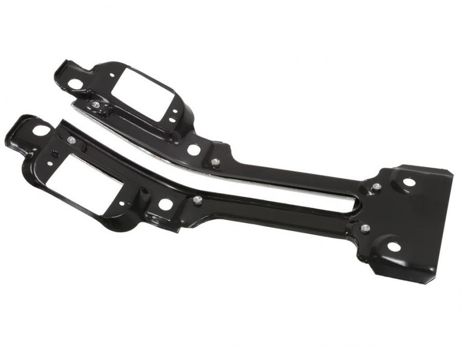 Stamped steel emergency brake console reinforcement. Painted black with a chrome plated die cast trim ring that guides the parking brake handle platic slider.