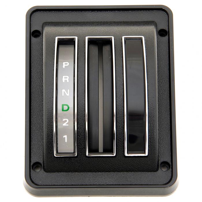 • Features black textured background with chrome accents, rubber shifter seal and shifter dial
