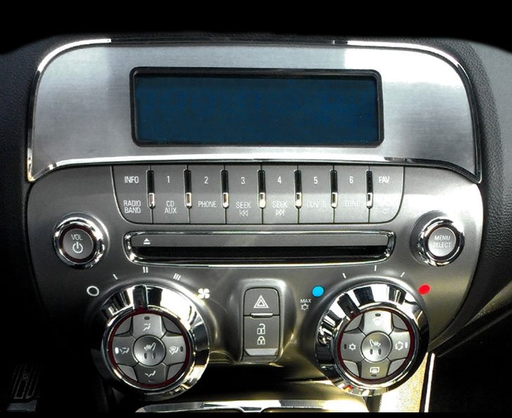 Dress up your Camaro with our brushed stainless steel with polished trim Camaro Factory Radio Trim Plate. This trim kit is designed to fit over the factory radio and adds a clean stylish look to your Camaro interior.