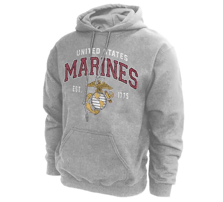 This Marines Vintage Block Logo Hoodie combines classic style with modern comfort. This hoodie features a retro-inspired block design of the iconic Marines logo. Poly/Cotton blend