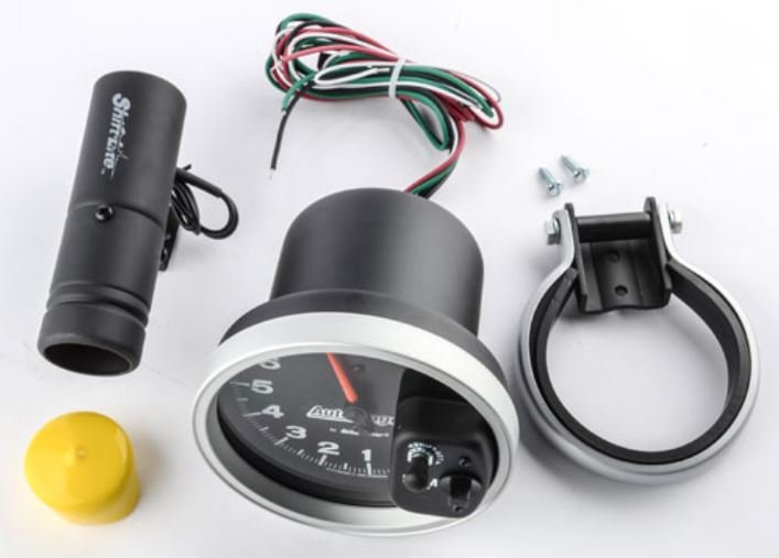 Tachometer; Autogage (R); Aftermarket; 5 Inch; Full Sweep; Analog; 0-10000 RPM; With Peak Memory and External Shift Warning Indicator; Black Face/ Chrome Cup/ Orange Needle; Incandescent Around The Dial; Operates On 4/6/8 Cylinder Engines With Points; Electronic; And Most 12V High Performance Racing Ignitions
