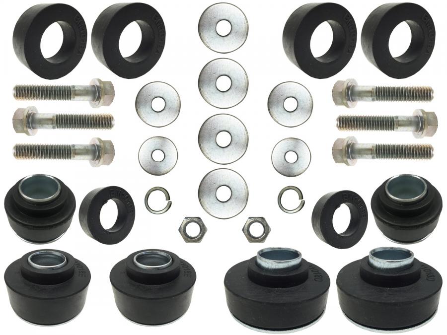 This body mounting kit contains all mounting bushings with all hardware included. It is correct S.B.R. compression molded with steel sleeve inserts. Bushing are made of high grade non recycled rubber. This grade 5 hardware features high quality 18 piece hardware set. OE style bolts are medium carbon steel, quenched and tempered.