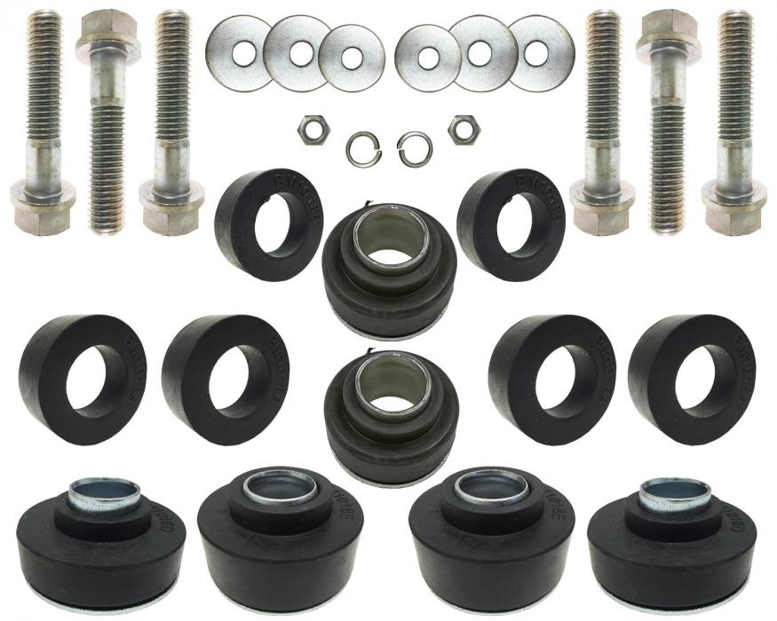 This body mounting kit contains all mounting bushings with all hardware included. It is correct S.B.R. compression molded with steel sleeve inserts. Bushing are made of high grade non recycled rubber. This grade 5 hardware features high quality 18 piece hardware set. OE style bolts are medium carbon steel, quenched and tempered.