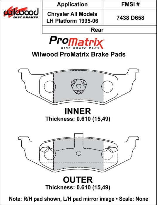 Wilwood Brake Pad part number 150-D0658K has a pad type #D658 with compound PM - ProMatrix and is for use in street performance / racing pads applications.
