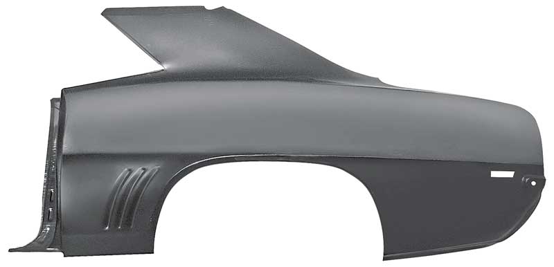 Reproduction complete quarter panel for 1969 Camaro coupe models. Each panel is precision-manufactured in high-quality stamped steel to original factory specifications for an authentic fit and finish. Unlike a simple quarter skin, this panel replaces the entire quarter section including the door jamb, trunk gutter, upper sail panel, and more. Designed to attach at the original factory seams, ensuring a seamless restoration. Finished in durable black EDP (electrophoretically deposited) coating for long-lasting rust and corrosion protection.