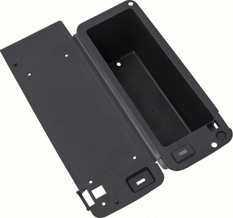 Reproduction of the original console glove box that fits directly into console area and provides space for storage. Includes the plastic top lid portion for easy mounting of original or reproduction padded console lid. After many years of use, this plastic inner console box generally needs to be replaced due to cracking.