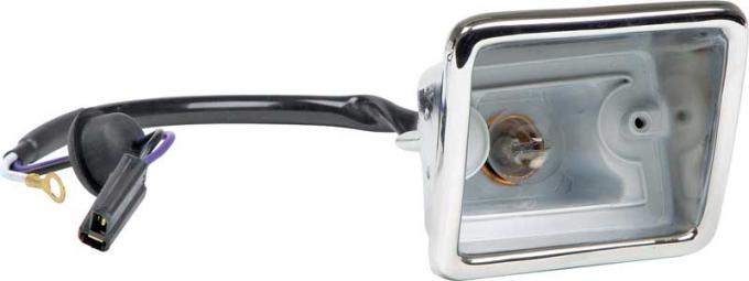 Reproduction of the original park lamp housing used on all 1967 Rally Sport Camaro models. Installs in lower front valance panel. Includes correct color wiring with rubber wiring grommet, crimped harness sleeve, correct style ground connector and wiring connector installed. Note: Lens, bulb, screws, gaskets and mounting brackets sold separately.