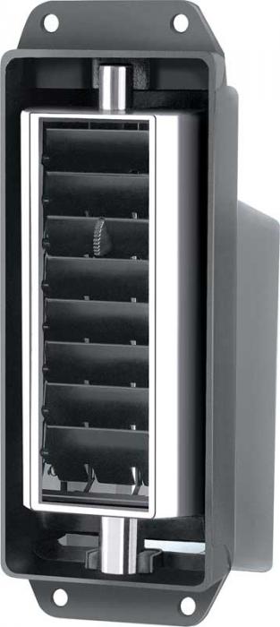 Reproduction dash side vent for 1969 Camaro models without AC. Each dash side vent features a chrome plated plastic air vent with correctly textured black plastic fins. Vent housings are manufactured in injection-molded ABS plastic as original and feat ure foam bushings on vent roller surfaces for smooth operation and correctly positioned mounting holes.