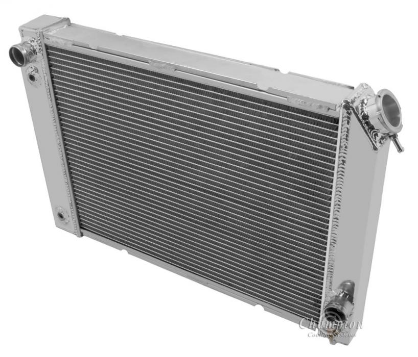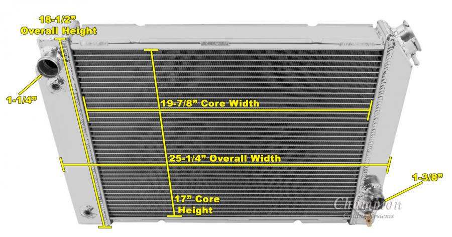 Our Champion Pro series radiators are designed to cool your high performance engine and to keep you and your car on the road. The Champion Pro series is designed using 11/16” tubes. These radiators are built with three rows of tubes, brazed aluminum cores which are tig-welded to aluminum tanks. All have approximately 14-16 louvered fins per inch, a brass petcock, and all are designed with aircraft grade aluminum. The strength of the aluminum allows for the improved design of larger tubes which allows a lightweight more affordable aluminum radiator to outperform a copper-brass radiator of similar dimensions. These radiators are typically 30-40% more efficient than their copper-brass equivalent. We would recommend one of these radiators for vehicles applications with 800 horsepower or less.