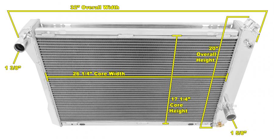 Our Champion Pro series radiators are designed to cool your high performance engine and to keep you and your car on the road. The Champion Pro series is designed using 11/16” tubes. These radiators are built with three rows of tubes, brazed aluminum cores which are tig-welded to aluminum tanks. All have approximately 14-16 louvered fins per inch, a brass petcock, and all are designed with aircraft grade aluminum. The strength of the aluminum allows for the improved design of larger tubes which allows a lightweight more affordable aluminum radiator to outperform a copper-brass radiator of similar dimensions. These radiators are typically 30-40% more efficient than their copper-brass equivalent. We would recommend one of these radiators for vehicles applications with 800 horsepower or less.