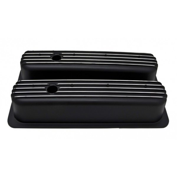 Dress up your baby without breaking the bank! These tall style black finned polished aluminum center bolt valve covers are a great addition to any restoration Chevy, helping your engine perform well and look great doing it. In 1.25" push-in style, these valve covers are just what you need to get your restoration going in the right direction. Cast aluminum. Mounting hardware is included. Fits 396, 427, 454, and 502 engines.