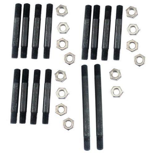Complete set of studs and nuts for the head. Includes the slightly longer stud for the stamped ignition clamp.Studs are made of 8740 chrome-moly steel. Guaranteed not to stretch, grade 8 nuts. U.S.A.Kit includes:2 long studs for water outlet11 short studs1 ignition clamp stud for stamped steel style clamp14 head nuts
