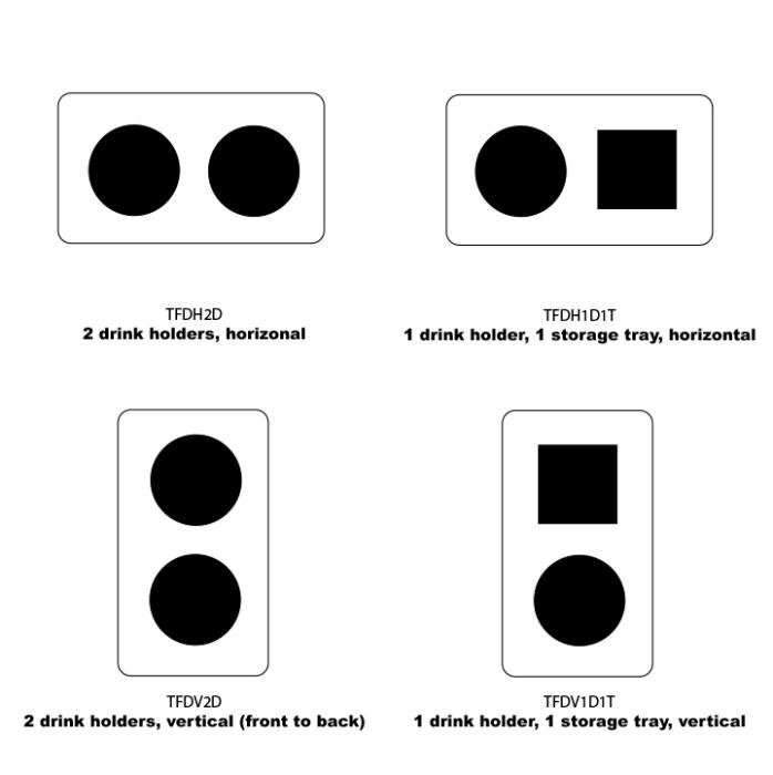 • The Dual Versions TFDH2D 2 drink holders, horizontally TFDH1D1T 1 drink holder & 1 storage tray, horizontally TFDV2D 2 drink holders, vertically (front-to-back) TFDV1D1T 1 drink holder & 1 storage tray, vertically (front-to-back)