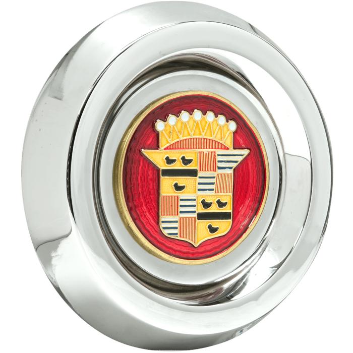 This is a Cadillac wire wheel center cap. Cadillac wire wheels have always been popular, even as lowered customs and lead sleds. These Cadillac center caps fit our Cadillac wire wheel, and the authentic shield is on a bright red background, just like the originals.