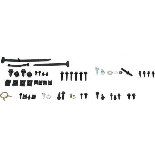 Correct hardware kit for mounting AC firewall box, condenser, heater hose grommets, relay, resistor and vacuum tank. 52 pieces in all