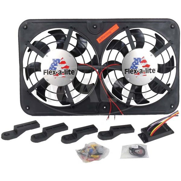 Draws 14-22 Amps The Flex-A-Lite Dual Electric Radiator Fan System is the most powerful system on the market today. It pulls 2500 CFM and totally eliminates the need for the stock fan and shroud. The dual 12 fans fit compactly in a shroud area and measures only 2-5/8 in depth, 26-1/4 across, and 15-1/2 high. With these measurements, it will fit almost all Ford's (please measure your radiator core before ordering) and can be mounted either on the radiator core support with supplied brackets or through the radiator using mounting straps. This system allows you the flexability of operating both fans thermostatically or one on continuously and one thermostatically. All mounting hardware and instructions are supplied.