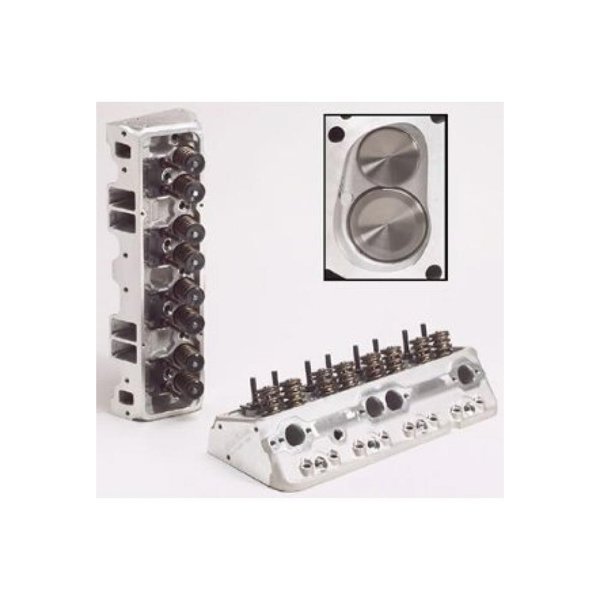 The Edelbrock Cylinder Head offers improved performance throughout the RPM range for great throttle response and dyno-proven increases in horsepower. Top quality features include threaded inserts in rocker studs and exhaust bolt holes for superior strength and durability and manganese-bronze valve guides. This cylinder head retains an exhaust crossover passage and is a street legal replacement part. It features intake and exhaust port openings that are CNC machined and designed for maximum flow velocity. This head is available with stainless steel intake and exhaust valves with undercut stems, 2-ring positive oil control seals, rocker studs, hardened steel guideplates, valve springs, retainers and keepers. It has a 2.020'' intake valve, a 1.600'' exhaust valve and a 1.460'' valve spring that allows a 0.575'' maximum lift.