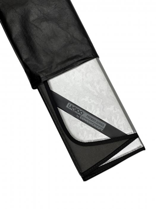 Custom-fit to your exact windshield and designed to protect your vehicle from UV damage while dramatically lowering the vehicle temperature. Elegant black backing and includes a free storage bag.