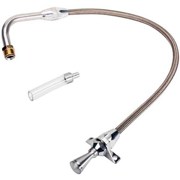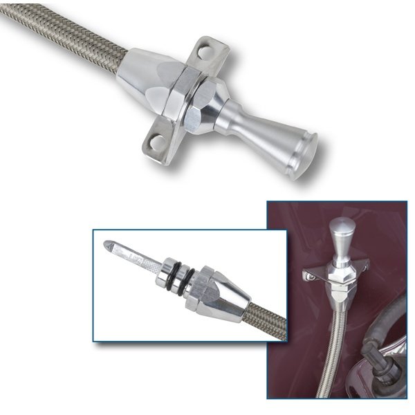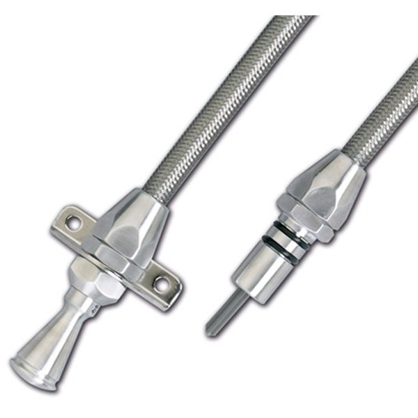 Now you have some flexibility with Lokar's Teflon-lined Flexible Braided Stainless Transmission Dipstick. This kit comes complete with a braided stainless steel outer housing and heat-resistant, E-Z to read, flexible inner dipstick measuring cable. The inner cable is molded with the appropriate transmission fluid level markings and is sealed tight with double O-rings. This kit is available in both a versatile firewall mount version which can be mounted anywhere under the hood, or a transmount version that mounts directly to the transmission bell-housing. It comes in your choice of bare stainless steel or black, and includes a dipstick funnel adapter to assist in filling transmission fluid. Complete installation instructions are included as well. As an added bonus, the billet aluminum handle and billet aluminum fittings complement Lokar's Flexible Engine Dipsticks perfectly. All Lokar products are backed by a lifetime warranty and proudly made in the USA.