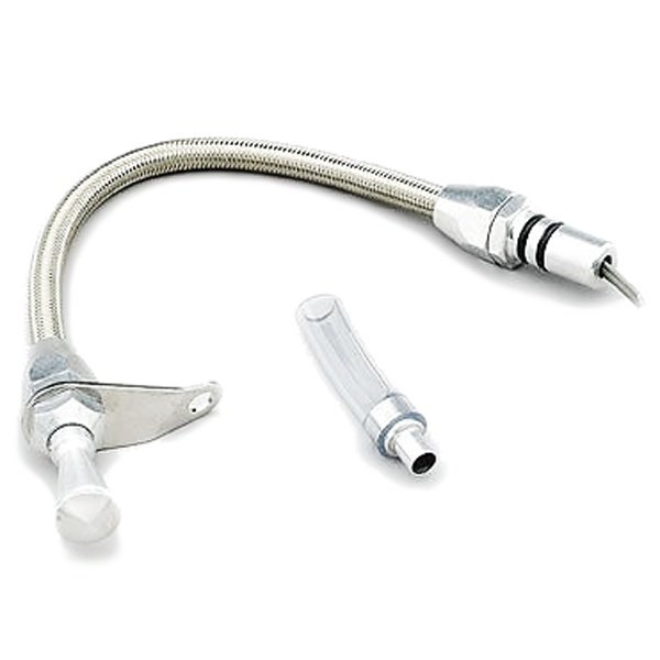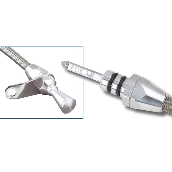 Now you have some flexibility with Lokar's Teflon-lined Flexible Braided Stainless Transmission Dipstick. This kit comes complete with a braided stainless steel outer housing and heat-resistant, E-Z to read, flexible inner dipstick measuring cable. The inner cable is molded with the appropriate transmission fluid level markings and is sealed tight with double O-rings. This kit is available in both a versatile firewall mount version which can be mounted anywhere under the hood, or a transmount version that mounts directly to the transmission bell-housing. It comes in your choice of bare stainless steel or black, and includes a dipstick funnel adapter to assist in filling transmission fluid. Complete installation instructions are included as well. As an added bonus, the billet aluminum handle and billet aluminum fittings complement Lokar's Flexible Engine Dipsticks perfectly. All Lokar products are backed by a lifetime warranty and proudly made in the USA.
