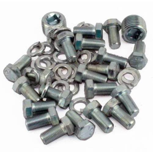 Kit includes 2 of the A-4030 drain plugs, 20 bolts and 20 lock washers for attaching the axle housings to the axle center section. The bolts in this kit are a standard headed bolt, not the authentic style thick headed bolts. If you want the authentic style bolts, order our A-4035-MB bolt kit.