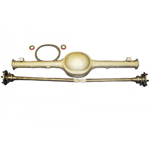 Super Durable Brand New 9 Ford Rear Axle Includes New Big-Bearings, Torino Flanges & 31-Spline Axles All Spring Perches, Tabs & Brackets Welded Into Place Rear Axle Bolt Pattern Is Chevy 5 On 4-3/4 Unless Specified Bearing Pocket Flanges Are Late Big-Bearing Torino Style That Measure 3-1/2 x 2 Bolt Centers With 3/8 T-Bolts Specify Drum-To-Drum Width (A In Diagram Below Photo) & Spring Perch Center To Center Width (B In Diagram Below Photo) When Ordering