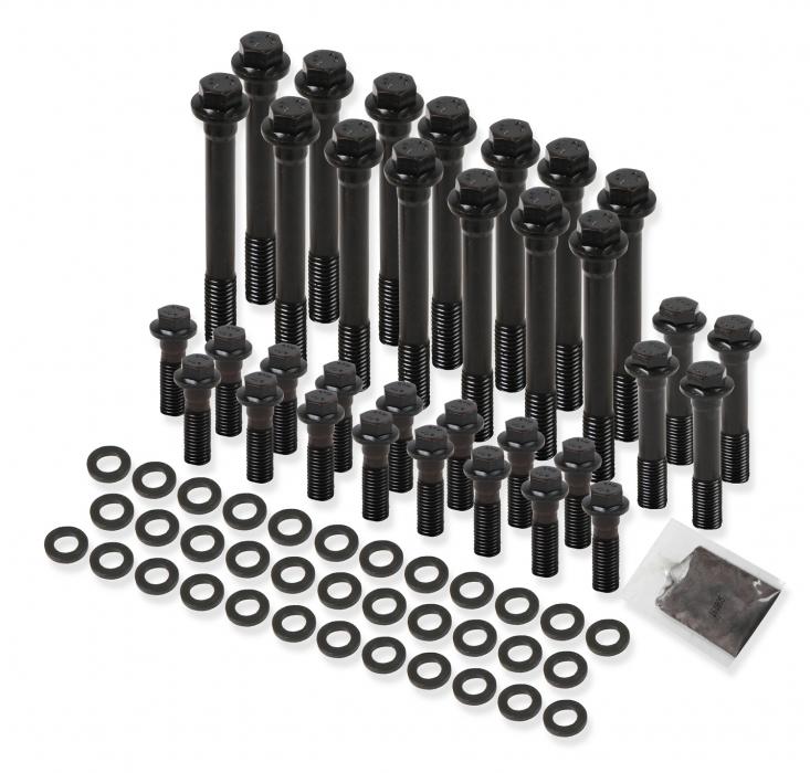 Earl's Racing Products head bolts are made from premium quality 170,000 psi chrome moly alloy steel (about 15% stronger than Grade 8). These bolts have a reduced wrench size (choose from 12-point or hex head) for extra socket clearance (provides extra clearance to rocker arms when re-torqueing heads). The wide flanged head provided more support for the extra thick chrome moly washers. These head bolts are reusable and are the ideal way to upgrade the performance of your engine, and eliminate the hassle and cost of replacing factory style torque-to-yield style bolts each time the cylinder heads are removed. Black oxide finish & sold in complete engine sets. Made in the USA. EARL'S, EARL'S,Includes: EARL'S,(16) 7/16"-14 x 1.750" Long Bolts EARL'S,(4) 7/16"-14 x 3.06" Long Bolts EARL'S,(14) 7/16"-14 x 3.78" Long Bolts EARL'S,(34) 7/16" Washers EARL'S,Anti-Seize