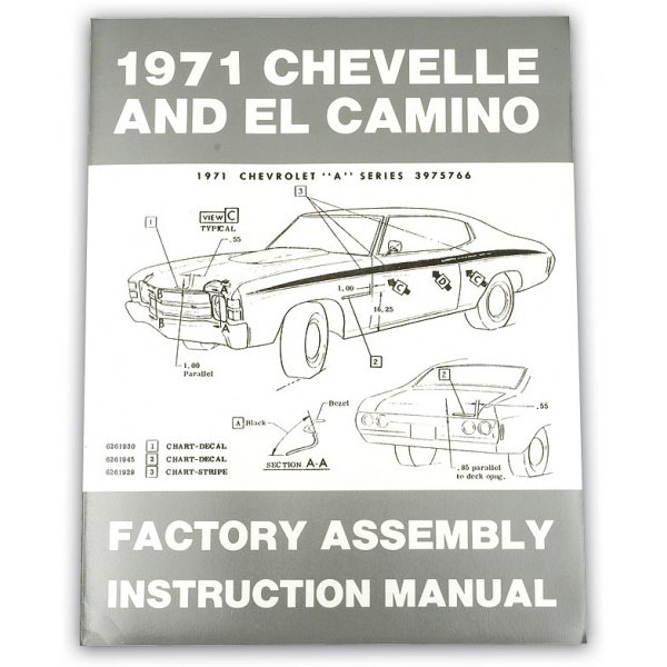 Practically An Instruction Manual On Installing Parts Detailed Drawings Highlight Step By Step Assembly Torque Specs For Fasteners Throughout Emblem Placement Measurements Covers El Camino & Chevelle The El Camino Stores assembly manuals are detailed reproductions of the books used on the Chevrolet assembly line. Multitudes of exploded view illustrations depict how the car was originally assembled. These manuals are highly recommended for doing any type of restoration work on your El Camino. The best investment you can make before starting any restoration. Trust The El Camino Store to get you to the finish line.