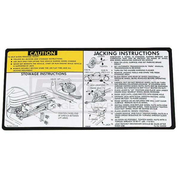 Reproduction Of Original For Use With El Camino's And GMC Caballero Located On The Rear Floor Plastic Cover This El Camino reproduction jacking instruction decal has been manufactured to original factory specifications using today's modern manufacturing techniques. You will find the fit, finish and function will work superbly for your restoration. In addition, using a reproduction jacking instruction decal from the El Camino Store will add authenticity and value to your vehicle.