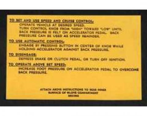 Reproduction Of Original Correct Instruction Tag As Found When Your Car Was New Contains helpful Operating Instructions This Camaro reproduction cruise control instruction tag has been manufactured to original factory specifications using…