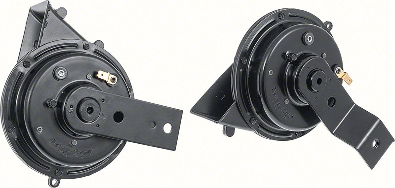 Quality reproduction of the original horn assembly designed for use with 1962 Chevrolet Impala, Bel Air, and Biscayne models. These exact reproductions feature correct semi-gloss black "swirl" shaped housings, with "Delco-Remy" words in the original font. Features the correct mounting brackets specifically designed for use with 1962 models installed on the horns. Each pair includes a high and low note horn. Officially licensed by General Motors.
