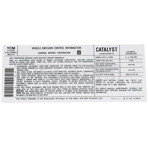 El Camino Emission Decal, 305 c.i. (5.0) Automatic Transmission, Code YCM, 1986