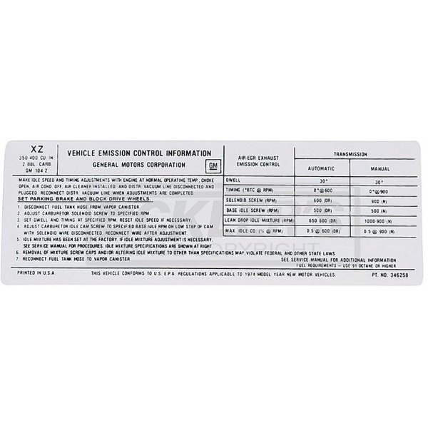 Reproduction Of Original Correct Show Ready Decal Good Condition Decal Required In Some States To Pass Emissions Testing Emissions Decals Can Vary, To Verify You Are Ordering The Proper Decal You Must Match The Emissions Code Located On The Corner Of Your Original. This Is A Reproduction Of Decal Code XZ 1974 El Camino & GMC Sprints sold in California and New York came factory with certain smog requirements including a visible emissions decal under the hood. Many states now have adopted California and New York standards above Federal standards setting the bar that much higher requiring in many cases clear display of these labels and decals. All 1971 and newer El Caminos have emissions labels or decals showing that they were manufactured to meet either California or U.S. Federal standards. This 1974 XZ El Camino emissions label or decal is affixed in the engine compartment or in a readily accessible location. At the top of this El Camino Emissions label are the words VEHICLE EMISSION CONTROL INFORMATION and the corporate name or trademark of the GM. If you live in an area that requires CARB (California Air Resources Board) or other Federal standards, make sure your emissions system meets requirements by checking with local rules and laws. The El Camino Store is proud to offer correct 1974 XZ 350ci and 400ci emissions labels to insure your El Camino, Super Sport, GMC Sprint, GMC SP, Estate or other variant looks its best and is legal to drive where you live. Remember, most states require your El Camino to possess emission standard equipment in order to pass smog and get registered. Trust the El Camino Store for all your El Camino needs, from daily driver, show, or just to enjoy, we can get you there.