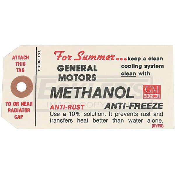 Reproduction Of Original Correct Tag That Hung Off Radiator When Your Car Was New Adds That Fresh Touch To Any Restoration This El Camino reproduction engine compartment antifreeze tag has been manufactured to original factory specifications using today's modern manufacturing techniques. You will find the fit, finish and function will work superbly for your restoration. In addition, using a reproduction engine compartment antifreeze tag from the El Camino Store will add authenticity and value to your vehicle.