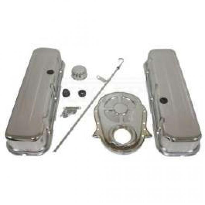 Great Dress Up Items For Chevy Big Block Conversions Kit Includes Valve Covers, Breather Cap, Timing Chain Cover, Dipstick And Tube Highly Polished Chrome Finish Baffled Short Smooth Valve Covers 2 5/8 Tall Fits 396, 427, 454, & 502 Engines Bulit Between 1965-1995 Dress up your 1949, 1950, 1951, 1952, 1953 or 1954 Early Chevy big block conversion with a touch of chrome. Our kit includes short valve covers with a push in breather cap, timing chain cover and a dipstick with tube. The kit pricing lets you save big over purchasing each item individually.