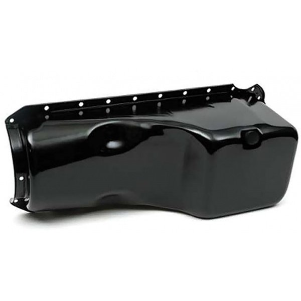 Chevy big block stock capacity chrome oil pan fits 1965-1990 V8 396-402-427-454 engines. 4 quart (stock) capacity. The dipstick is on the passenger side. You can use the original oil pump pickup. This oil pan does not fit Gen V motors with a one-piece rear main seal or 1962-67 Chevy II Chevelle's with steering behind the crossmember. DOES NOT COME WITH OIL PUMP PICK UP.