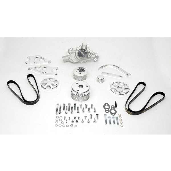 Edelbrock aluminum waterpump - short, std rotation 5.00 inch crank pulley 4.25 inch waterpump pulley 2.00 inch alternator pulley Alternator bracket assembly A/C Compressor bracket assembly Alternator fan Alternator pulley cover A/C compressor nose cover Goodyear Gatorback belts Chrome hardware
