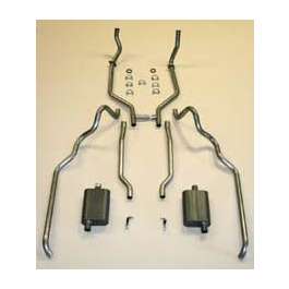 This system fits 2 and 4 door hardtop and sedan, but won't fit convertibles or station wagons. It features original style 2" pipes, but ours are aluminized with mandrel bends. No exhaust valve is required. Includes "donut" exhaust manifold gaskets and flanges. You can select tailpipes that turn down at the ends like the originals, or come straight out under the bumper. It works with original hangers (not included), but you can purchase universal hangers from us or locally. The mufflers are "Quickflow" brand, which feature a deep, rich tone. This is an extremely high-quality exhaust system, and will compliment even the nicest cars.
