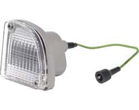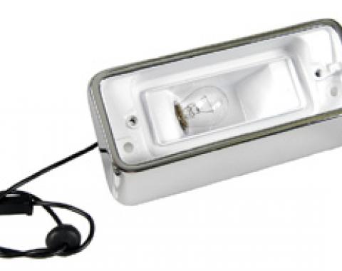 Accurate chromed die-cast reproduction with white enamel inlay. Correct in every way. Housing includes wiring, rubber boot, grommet, bulb and connector. RH (passenger) side only. Officially Licensed GM Restoration Parts.