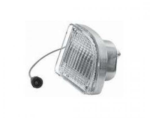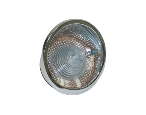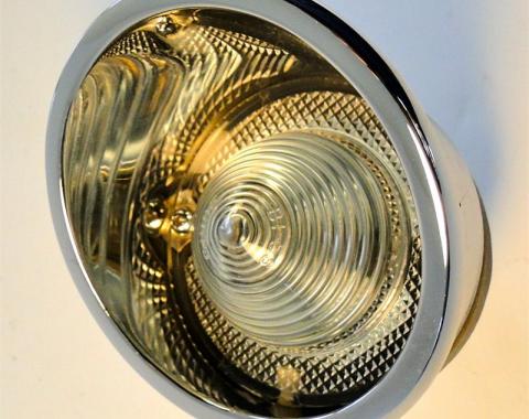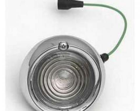 Accurate chromed die-cast reproduction with white enamel inlay. Correct in every way. Housing includes wiring, rubber boot, grommet, bulb and connector. LH (driver) side only. Officially Licensed GM Restoration Parts.