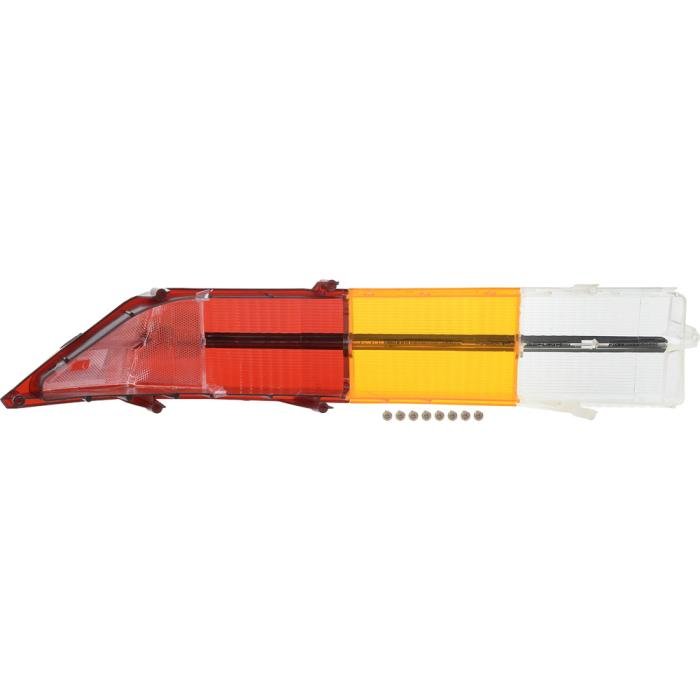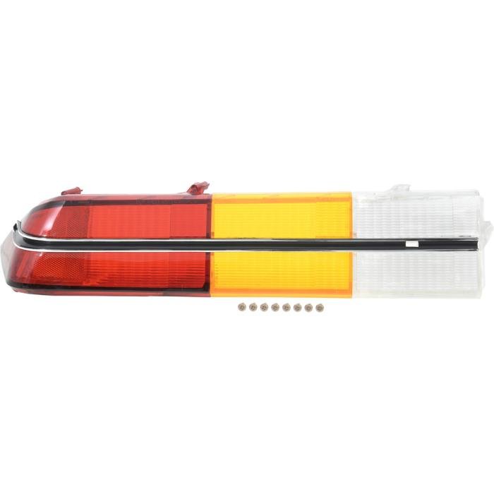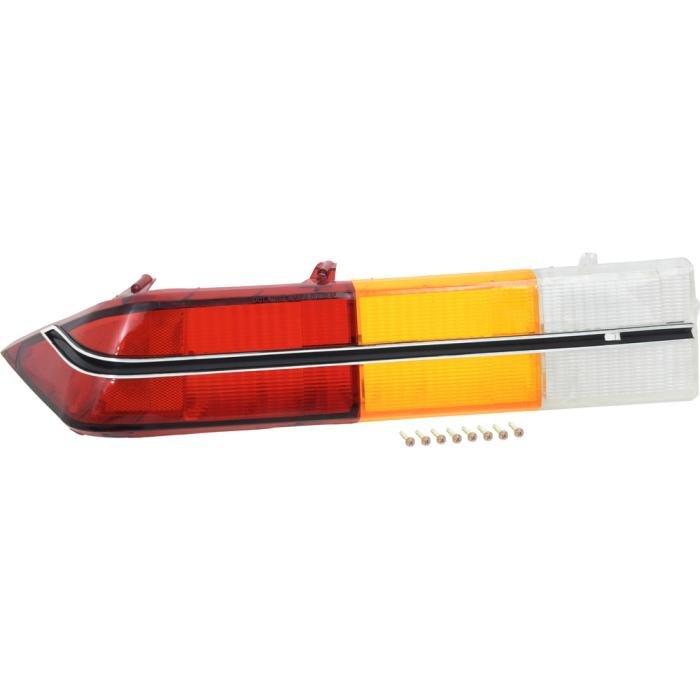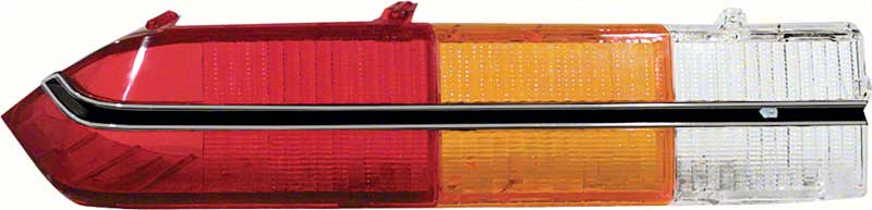 Reproduction tail lamp lens for 1979-81 Camaro Berlinetta models. This reproduction lens is manufactured in high quality injection molded acrylic lens material. The Berlinetta models featured a horizontal aluminum molding unlike the standard models. The lens comes complete with this black and chrome aluminum molding replicating the original in appearance and authenticity. Features all original SAE and "Guide" markings for an authentic replacement. Fits the LH, driver side.