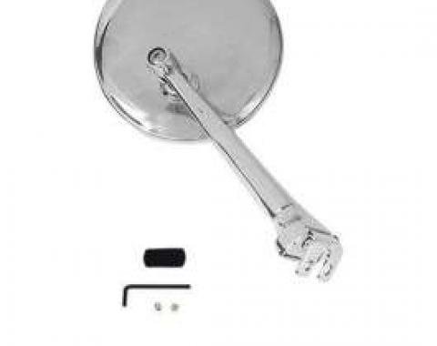 Factory-correct reproduction assembly with chrome finish and rectangular mirror head installs on the driver side door