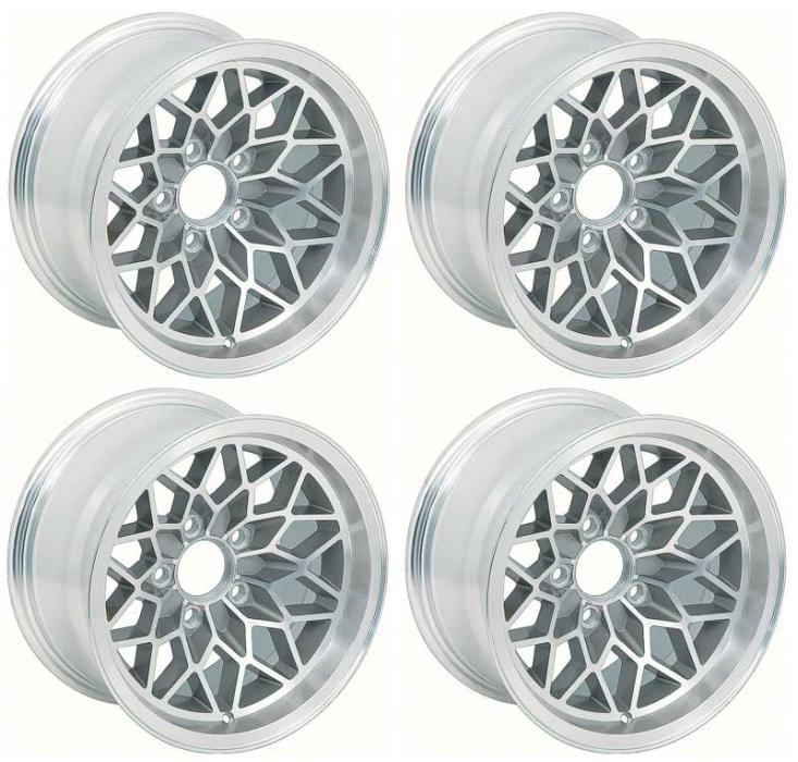 Reproduction of the original cast aluminum "Snowflake" wheels designed for use with 1978-81 Pontiac Firebird and Trans Am models. This wheel set was originally part of the WS6 option package on 1978-81 Trans Am models. Each set has silver painted inserts and is finished with a clear coat as original. Features 4-1/4" backspacing and 5 x 4-3/4" bolt pattern. Wheel weight is 24 lbs.
