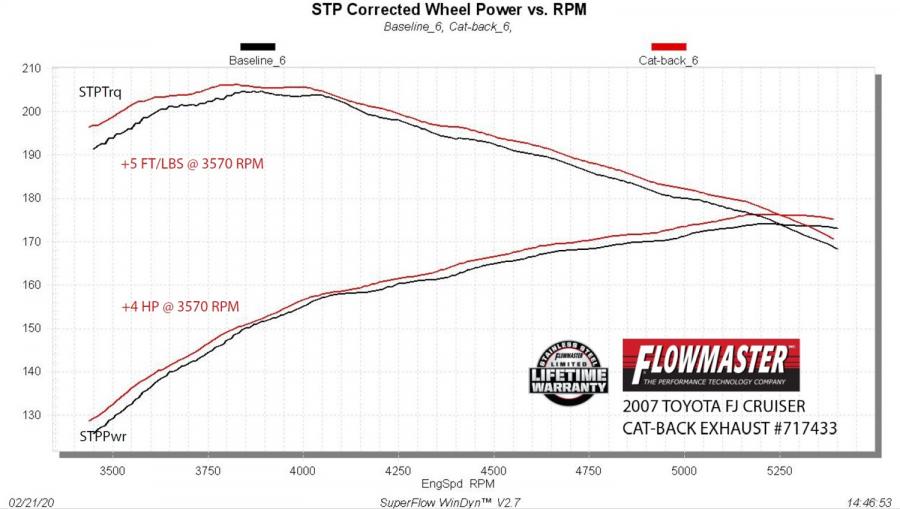 The new Flowmaster® FlowFX® cat-back exhaust system for the 2007-2014 Toyota FJ Cruiser is manufactured using durable 409 stainless steel throughout and features 2.50-inch mandrel bent pipes for better exhaust gas flow, and a FlowFX "straight-through" muffler for great sound and maximum performance. The system is finished off with a 3.50-inch diameter black ceramic-coated 304S stainless steel tip, giving your FJ a custom look that goes hand in hand with that deep performance FlowFX sound. The system uses all the existing factory hanger locations and includes installation instructions and all necessary hardware for an easy installation that you can do at home. Backed by Flowmaster's lifetime Limited Warranty.
