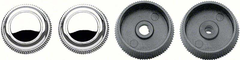 This radio knob set will replace the old or worn out original knobs on factory in-dash radios. Knobs are manufactured in zinc die-cast metal with polished chrome finish. The volume and tuning knobs are injection molded to factory specs.