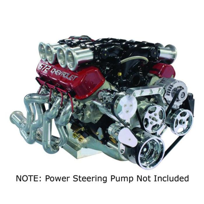 Designed for Big Block Chevrolet applications with power steering (pump not included) this kit features machined-finish brackets a polished compressor and alternator chrome pulleys and polished clutch and tensioner covers.