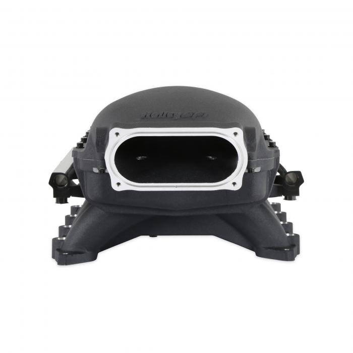 The Ultra Lo-Ram provides an additional 19.4mm front and 42.6mm rear clearance compared to the Ford Performance Cobra Jet manifold, plus clears 2015-2023 Mustang factory hoods. Offered in both round and oval throttle body configurations, with replacement front inlets for easy interchangeability. The oval inlet can accommodate up to a 150x66mm single throttle body and 93mm on the round variant. Round inlets include standard mounting provisions for GT350, GT500, and LS 4-bolt throttle bodies. 2011-2023 GT throttle bodies can be used with the optional 717-18 adaptor.